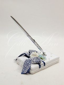 Свадебная ручка с подставкой Gilliann Rustik Velvet PEN020 Свадебная ручка с подставкой Gilliann Rustik Velvet PEN020 является частью коллекции Gilliann Rustik Velvet, которая, в последнее время, все больше и больше набирает популярность. Казалось бы, очень простое оформление, нет в ней помпезности и сильной вычурности, но, тем не менее, ручка с подставкой несут в себе деревенскую роскошь, как и положено в популярном стиле рустик. Данный свадебный аксессуар прекрасно будет работать в паре с папкой для свидетельства о браке, так как оба применяются на одной и той же церемонии. Свадебная ручка выполнена в серебристом цвете, подставка изготовлена из белого атласа, широкая ажурная кайма проходит по всему периметру изделия. Так же по контуру аккуратно приделали половинки жемчужин в строгий ряд. Главным украшением подставки является необычный сине-белый кружевной бант, с красивой белой розой в центре. Мелкие голубые розочки хаотично расположены рядом, вместе с перламутровыми бусинами. Данный стиль смотрится очень празднично и одновременно довольно естественно, натурально. Материалы и декор: атлас, атласные ленты, кружевные ленты, искусственные цветы, бусины, декоративная тесьма <!--SPEC_HTML_EDITOR_SELECTION_START--><!--SPEC_HTML_EDITOR_SELECTION_END--> None