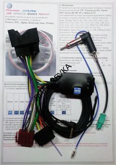 Интерфейс позволяет согласовать кнопки на руле для автомобилей Volkswagen Touareg, B6, Tiguan, Multivan T5, с распространенными, на наш взгляд, магнитолами: Pioneer, JVC, Alpine, Kenwood, Sony, Prology, Clarion. Для настройки не нужен пульт дистанционного управления от магнитолы. Выбор марки магнитолы осуществляется с помощью переключателей. Управление магнитолой может быть как проводным так и ИК способом. В комплекте имеются разъемы для автомобиля и магнитолы (VW-ISO и VWantena). Антенный адаптер в комплект не входит!!!! None Возможен самовывоз. Есть доставка.