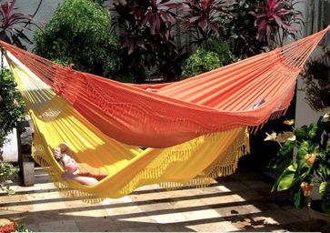 Стильный, большой комфортный гамак ФОРРО сделан из высококачественного хлопка, мягкое волокно которого прекрасно адаптируется к форме тела и дышит. Цвет оранжевый или желтый. Полотнище гамака отделано бахромой (сделано вручную), которая сплетена из волокон настоящего бразильского ореха и сделана в цвет полотна гамака. Гамак такой формы это традиционная форма исконно южно-американских гамаков, «правильно» и удобно лежать в таких гамаках по диагонали. Сделано в Бразилии.