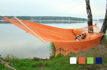 Цена указана за гамак без каркаса. Красивый большой гамак TULIP сделан вручную из высококачественного хлопка. Мягкая фактура материала прекрасно адаптируется к форме вашего тела. Полотно гамака украшено бахромой, сплетенной вручную из волокон настоящего бразильского ореха - дерева, растущего только на севере Бразилии, из бразильского ореха делаются и стропы - петли. Для поперечных перекладин используется древесина "Массарандуба", продукция заверена "SmartWood", компанией, которая придерживается строгих экологических стандартов. Цвета оранжевый, зеленый, белый, синий, произведено в Бразилии.