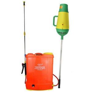 Опрыскиватель модели ОЭ-20л-В может использоваться, как с телескопической удочкой, так и с распыляющей воздуходувкой. Для того, чтобы использовать опрыскиватель с распыляющей воздуходувкой, подсоедините один штекер кабеля питания воздуходувки к разъему для подключения зарядного устройства, а другой штекер к распыляющей воздуходувке. Затем подсоедините нагнетающий шланг к распыляющей воздуходувке. Для опрыскивания высоких деревьев вставьте в распыляющую воздуходувку удлинительную штангу (идет в комплекте), а затем зафиксируйте ее посредством хомута. С помощью данной воздуходувки вы сможете опрыскивать высокие деревья мощным потоком распыленной воды (эффект тумана). Водяной столб при вертикальном положении достигает 4-х метров!