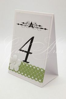 Карточка односторонняя Gilliann Table Numbers NUM011 Рассадочная карточка сделана в виде домика. Верхняя часть карточки украшена рисунком черного цвета, нижняя часть обтянута широкой полосой ажурной тесьмы с волнистыми краями. На зеленой тесьме эффектно смотрится белый цветок с жемчужиной в центре. В зависимости от стилистического решения Вашей свадьбы Вы можете подобрать любые сочетания цветов и декоративных элементов. Материал: дизайнерский картон, тесьма, декоративные элементы, жемчуг Размеры: 10х15 см. в сложенном виде. Мин. заказ 500 руб.