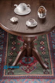 Две массивные вертикальные опоры стола, как и собственно ножки, и соединительная перекладина выполнены из натурального бука. На детали опор фрезерованием нанесены рисунки в растительных мотивах. Рисунок на соединительной перекладине венчает стилизованный цветок лилии.