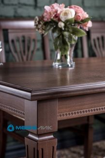 Столешницы выполнены из МДФ покрытого шпоном натурального ясеня. Ясень – это дерево, отличающееся кроме прочности, одним из самых красивых рисунков текстуры. В изделиях, решенных в цветах орех и белый ясень, текстура на столешницах остается видимой и это безоговорочно является естественным украшением столов. Кромка столешниц фрезерована сложным профилем по всей ширине кромки. Вдоль всех царг гравированием нанесен геометрический рисунок, подчеркивающий общий строгий классический стиль столов.