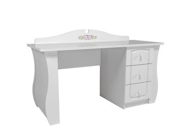Стол письменный МИРЭЛЬ Белый НМ 041.22 - удобный и однозначно запоминающийся предмет мебели, который станет ярким дополнением детской комнаты. Модель имеет гнутые боковины и тумбу с тремя выдвижными ящиками для хранения канцелярских принадлежностей.Столешницу украшает декоративный бортик с рисунком. Материал: ЛДСП 16 мм, МДФ