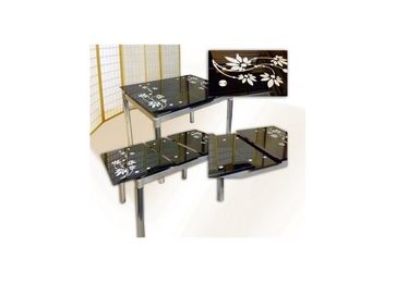 Столешница выполнена из 10 мм закаленного стекла, черная, с узором в виде цветов. Ножки хромированные
