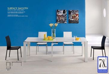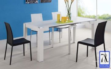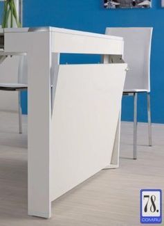 Стол-консоль B2370 — из небольшого столика шириной 47 см легко раздвигается до длины 229 см (!) за счет 3 панелей-вставок шириной по 60.8 см каждая. При максимальной длине можно усадить 14 человек. Стол выполнен из ламинированного МДФ белого цвета, устойчивых к появлению царапин и отпечатков. Средние ножки — из стали, окрашены в общий цвет стола и в сложенном виде скрыты внутри больших боковых ножек. Преимуществом этом модели является возможность хранения панелей-вставок внутри стола. Их можно устанавливать в любом количестве, и стол может иметь любой из 4 размеров. Основные ноги имеют внизу войлочные накладки, а средние ножки — ролики, что облегчает перемещение и раскладывание стола. Стыки верхних углов закрыты декоративными элементами серебристого цвета. Размеры (мм):