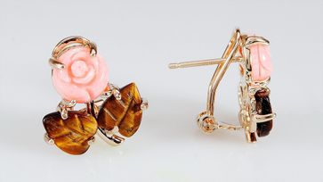 Закажите серьги коралл-тигровый глаз 1 резная роза 2 листа у компании Lotus в Москве на портале Alloy: