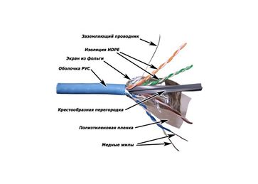- Медные жилы.2. Изоляцию HDPE3. Крестообразная перегородка4. Полиэтиленовая пленка5. Разрывная нить.6. Экран из фольги7. Заземляющий проводник8. Оболочка из ПВХ.