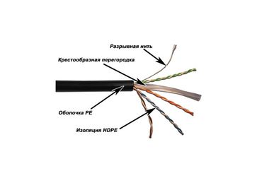 - Медные жилы.2. Изоляцию HDPE3. Крестообразная перегородка.4. Разрывная нить.5. Оболочка из PE.