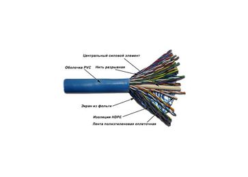 - Медные жилы.2. Изоляцию HDPE3. Разрывная нить.4. Экран из фольги.5. Уплотнительный шнур.6. Лента полиэтиленовая оплеточная.7. Оболочка ПВХ.