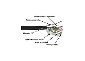 - Медные жилы.2. Изоляцию HDPE3. Трос подвесной4. Полиэтиленовая пленка5. Заземляющий проводник6. Разрывная нить.7. Экран из фольги8. Оболочка из PE.