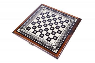 Инкрустированная шахматная доска – атрибут, без которого не обойтись всем любителям этой классической настольной игры. Выполненная из натурального массива бука и инкрустированная в технике маркетри доска – настоящее произведение искусства. Разыгрывать шахматную партию на ней – чистейшее удовольствие. По краю доска, скрепляющаяся нержавеющими износостойкими петлями, украшена оригинальным узором. Кроме того, она полностью покрыта защитным лаком, увеличивающим долговечность.