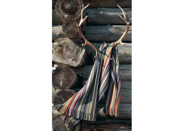 Плед из натуральной шерсти мериноса Cortina7 с бахромой. Узор пледа - тонкие полоски, ярких цветов: желтого, оранжевого, красного, малинового, зеленого и др.