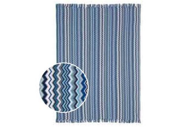 Плед с бахромой из натуральной шерсти мериноса Firenze 6. Узор пледа - продольные зигзагообразные полосы различный холодных оттенков: от светло-голубого до глубокого темно-синего.