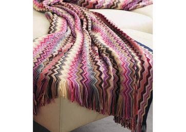 Плед с бахромой из натуральной шерсти мериноса Firenze 6. Узор пледа - продольные зигзагообразные полосы различный оттенков: розовый, сиреневый, вишневый, бежевый, коричневый, серый и др.