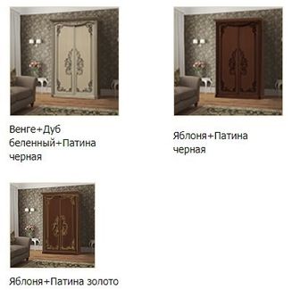 Цвета: венге + дуб беленный + патина черная; яблоня + патина черная; яблоня + патина золото