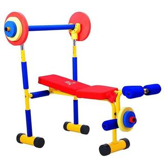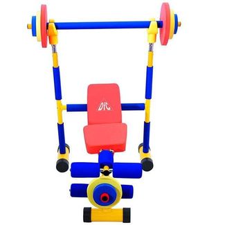 Надежная конструкция. Для безопасности ребенка имеет защитные покрытия на элементах тренажера.Мягкое сиденье. Стойки под штангу регулируются по высоте (2 положения).Упражнения: жим штанги, сгибание и разгибание ног. Штанга и веса в комплекте. Общие характеристики: Возраст ребенка: от 3 до 7 летВес ребенка: до 50 кгНагрузка на тренажер: 68 кгРазмер в рабочем положении:Размер упаковки: 86 х 33 х 22 смВес: 8,6 / 10,5 кгГарантия: 12 месяцев None