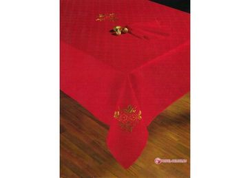Хлопок можно назвать самой эстетически правильной тканью: он хорошо впитывает. Столовое белье из этой ткани легко гладится, при необходимости его можно стирать при температуре до 90С. Срок его службы выше, чем у льна, и в зависимости от частоты эксплуатации колеблется от трех месяцев до полутора лет. Скатерть из хлопка смотрится богато и эффектно. К минусам этой ткани можно отнести усадку. На скатертях длиной до 2 м усадка не заметна, а вот на изделиях большего размера из 100%-ного хлопка она достигает 10%.