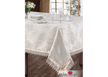 Комплект столового белья 5 предметов. Размер скатерти: овальная 150х180 см. Размер салфеток: 40х40 см. (4 шт.) Материал: Жаккард Отделка кружево