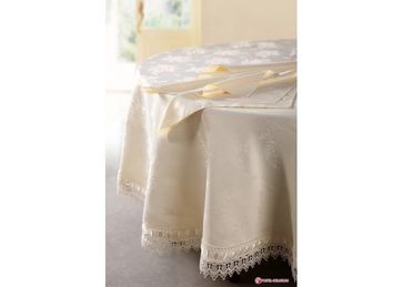 Артикул: sl8678 Производитель: SoftLine Страна производства: Китай Состав: Ацетатный шелк жаккард. Отделка: кружево. Скатерть овальная 180х270 см - 1 шт, салфетки 40х40 - 8 шт.