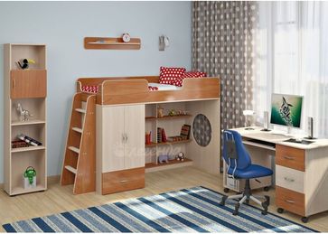 Комплектация: • Кровать-чердак, габариты без лестницы (ДхШхВ): 1842Х834Х1395 мм., длина с лестницей: 2142мм. • Встроенный шкаф для одежды • Встроенные стеллажи для книг • Стеллаж отдельностоящий, габариты: 4502961845 мм. • Стол письменный, габариты: 1310600750 мм • Полка навесная, габариты: 800156140 мм.