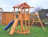 Мадрид 21 Детская деревянная площадка для дачи Технические характеристики: . Материалы: - каркас: клееный брус хвойных пород - горка: пластик, производство Бельгия . Длина ската горки: 3 м . Производитель: Россия В комплекте: . Скалодром (узкий) с канатом . Горка . Качели . Деревянная лестница с широкими ступенями . Гимнастические кольца . Песочница . Канат . Баскетбольный щит (приобретается дополнительно) . Гимнастический мат (приобретается дополнительно) . Боксерская груша (приобретается дополнительно) Размеры площадки (Д.Ш.В.): 470 х 510 х 320 см Вес: - кг Внимание! Цвет горки может отличаться от приведенного на фото. Описание: Детская игровая площадка для дачи с горкой и качелями Мадрид 21 изготавливается из высокотехнологичных, экологически безопасных материалов. Устойчива к неблагоприятным метеоусловиям, невосприимчива к перепадам температур и атмосферным осадкам и, при надлежащей эксплуатации и уходе, детские площадки для дачи, долгое время прослужат Вашим детям и внукам излюбленным местом для игр, занятий спортом и развлечений. Детские площадки для дачи представляют собой двухуровневые конструкции: первый этаж - песочница под деревянной крышей, второй этаж - уютная веранда под тентовой крышей. Игровая площадка комплектуется горкой (5 цветов: зеленый, красный, желтый, синий, салатовый, производство Бельгия, цвет горки комплектуется из имеющихся на складе). Детские площадки для дачи производятся из экологически чистых, тщательно обработанных, сертифицированных материалов: клееный брус хвойных пород сечением 90-95 миллиметров. Благодаря современным технологиям изделия из клееного бруса не дают усадки и не деформируются. Клей, при помощи которого ламели склеиваются между собой под большим давлением производится из компонентов, имеющих натуральное происхождение. Тщательно отшлифованные доски не оставляют следов контакта на одежде ребенка и исключают возможность занозиться. Также Вы можете при желании дополнительно приобрести боксерскую грушу и гимнастич