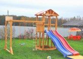 Мадрид 27 Детская деревянная площадка для дачи Технические характеристики: . Материалы: - каркас: клееный брус хвойных пород - горка: пластик, производство Бельгия . Длина ската горки: 3 м . Производитель: Россия В комплекте: . Сетка для лазания . Скалодром (широкий) с канатом . Горка - 2 шт. . Качели . Деревянная лестница с широкими ступенями . Гимнастические кольца . Веревочная лестница . Песочница . Канат . Баскетбольный щит (приобретается дополнительно) . Гимнастический мат (приобретается дополнительно) . Боксерская груша (приобретается дополнительно) Размеры площадки (Д.Ш.В.): 470 х 510 х 320 см Вес: - кг Внимание! Цвет горки может отличаться от приведенного на фото. Описание: Детская игровая площадка для дачи с горкой и качелями Мадрид 27 изготавливается из высокотехнологичных, экологически безопасных материалов. Устойчива к неблагоприятным метеоусловиям, невосприимчива к перепадам температур и атмосферным осадкам и, при надлежащей эксплуатации и уходе, детские площадки для дачи, долгое время прослужат Вашим детям и внукам излюбленным местом для игр, занятий спортом и развлечений. Детские площадки для дачи представляют собой двухуровневые конструкции: первый этаж - песочница под деревянной крышей, второй этаж - уютная веранда под тентовой крышей. Игровая площадка комплектуется горкой (5 цветов: зеленый, красный, желтый, синий, салатовый, производство Бельгия, цвет горки комплектуется из имеющихся на складе). Детские площадки для дачи производятся из экологически чистых, тщательно обработанных, сертифицированных материалов: клееный брус хвойных пород сечением 90-95 миллиметров. Благодаря современным технологиям изделия из клееного бруса не дают усадки и не деформируются. Клей, при помощи которого ламели склеиваются между собой под большим давлением производится из компонентов, имеющих натуральное происхождение. Тщательно отшлифованные доски не оставляют следов контакта на одежде ребенка и исключают возможность занозиться. Также Вы можете при желании д