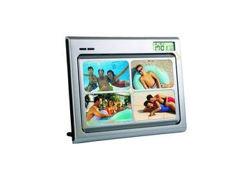 Рамка для фотографий (с одной стороны фотография 13х18 см и четыре фото 9,5х6 см с другой) с диктофоном на 5 сек., часами, датой, термометром, выбором музыки и возможностью крепления к стене Большая рамка для фото - 19,212,6 см, четыре маленькие - 9,35,6 см. Будильник издает звуки в виде писка. Фото меняется при снятии тонкой пластиковой пластиныВес единицы: 0.48 кг; Размер упаковки: 25,7х22,8х3см; Размер изделия: 24х2,1х20,2см; Материал сувенира: пластик; Батарейки: В комплект входят две батарейки - ААА; Инструкция: Есть