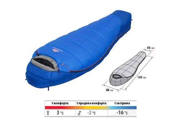 <h2>Трехсезонный спальный мешок-кокон.</h2> Если Ваш рост до 165 см, Вам нет нужды нести "лишние" 30 см спальника. Большая удача. Этот спальник предназначен также для подростков, поэтому он дополнительно утеплен. <h3>Особенности:</h3><ul> <li>Внешняя ткань : Polyester 190Т Dimond RipStop</li> <li>Внутренняя ткань : Polyester 190Т</li> <li>Утеплитель: APF-Isoterm 3D 2x175 г/м2</li> <li>Верхняя температура комфорта: 3°С</li> <li>Нижняя температура комфорта: -2°С</li> <li>Экстремальная температура -16°С</li> <li>Отделение под подушку с двумя входами</li> <li>Мягкий валик вдоль окна капюшона</li> <li>Лента от закусывания молнии</li> <li>Удобные затяжки разного цвета и форм</li> <li>Сетчатый внутренний карман</li> <li>Внутренняя ткань капюшона Soft Micro-Polyester</li> <li>Анатомический капюшон</li> <li>Тепловой воротник с обхватом 360°</li> <li>Люминесцентный брелок</li> <li>Возможность состёгивать спальники, имеющие молнии с правой и левой стороны.</li></ul><br> <p>Размеры (ДхШхВ): 180x80x55 см</p> <p>Размер в чехле : 22х38х28 см</p> <p>Вес: 1,5 кг.</p> None Можно купить без предварительного заказа. Возможен самовывоз. Есть доставка.