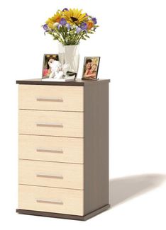 Компактный комод в спальню. Может быть использован, как дополнительная тумба к туалетному столику. Состоит из пяти ящиков, куда можно свободно разложить драгоценности, косметику, белье и все, что вы считаете нужным для создания порядка и комфорта в спальной комнате. Мебель изготавливается из ЛДСП 16 мм, края обработаны кромкой ПВХ. Задняя стенка — ДВП серого цвета. Характеристики: Материал: ЛДСП Высота 882 мм Ширина 490 мм Глубина 429 мм Цвет: Венге/Беленый Дуб Минимальная сумма заказа 1000 рублей. Возможен самовывоз.
