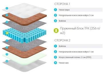 В модели "Lonax Cocos-Medium Econom" с одной стороны используется латексированная кокосовая койра - 100% натуральный жесткий материал, изготавливаемый из пролатексированных кокосовых волокон. С другой стороны используется современный искусственный экологически чистый материал ППУ (пенополиуретан) и для увеличения жесткости используется латексированная кокосовая койра - 100% натуральный жесткий материал, изготавливаемый из пролатексированных кокосовых волокон. В отличие от матраса “Lonax Cocos-Medium”, в этом матрасе используется вместо слоя натурального латекса слой ППУ (пенополиуретана), что делает его гораздо доступнее по цене, сохраняя надежность, комфорт и ортопедичность. Кол-во пружин на м2: 256 Длина (см): 190/195/200 Ширина (см): 120 Высота (см): 20 Жесткость (сторона 1): Высокая Жесткость (сторона 2): Средняя Максимальная нагрузка на одно спальное место (кг): 110 Ткань чехла (по умолчанию): Хлопковый жаккард (200 г/м2) СТАНДАРТ Основа: Пружинный блок TFK (256 п/м2) Минимальная сумма заказа 1000 рублей. Страна производства: Россия Возможен самовывоз.
