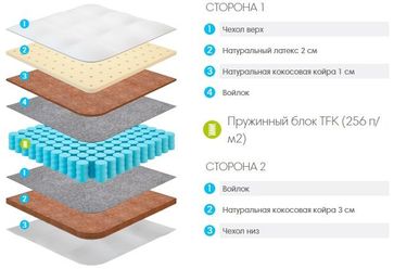 В модели "Lonax Cocos-Medium Light" с одной стороны используется латексированная кокосовая койра - 100% натуральный жесткий материал, изготавливаемый из пролатексированных кокосовых волокон. С другой стороны современный экологически чистый натуральный латекс и для увеличения жесткости используется латексированная кокосовая койра - 100% натуральный жесткий материал, изготавливаемый из пролатексированных кокосовых волокон. В отличие от матраса “Lonax Cocos-Medium”, в этом матрасе вместо натурального латекса 3см используется натуральный латекс 2см, что делает его доступнее по цене. Кол-во пружин на м2: 256 Длина (см): 190/195/200 Ширина (см): 140 Высота (см): 20 Жесткость (сторона 1): Средняя Жесткость (сторона 2): Высокая Максимальная нагрузка на одно спальное место (кг): 110 Ткань чехла (по умолчанию): Хлопковый жаккард (200 г/м2) СТАНДАРТ Основа: Пружинный блок TFK (256 п/м2) Минимальная сумма заказа 1000 рублей. Страна производства: Россия Возможен самовывоз.