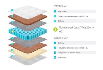 В модели "Lonax Round Cocos-Medium" с одной стороны используется латексированная кокосовая койра - 100% натуральный жесткий материал, изготавливаемый из пролатексированных кокосовых волокон. С другой стороны используется Латекс - 100% натуральный мягкий материал, изготавливаемый из млечного сока каучуконосных растений и для увеличения жесткости используется латексированная кокосовая койра - 100% натуральный жесткий материал, изготавливаемый из пролатексированных кокосовых волокон. Кол-во пружин на м2: 256Диаметр (см): 210 Высота (см): 21 Жесткость (сторона 1): Высокая Жесткость (сторона 2): Средняя Максимальная нагрузка на одно спальное место (кг): 130 Ткань чехла (по умолчанию): Хлопковый жаккард (200 г/м2) СТАНДАРТ Основа: Пружинный блок TFK (256 п/м2) Минимальная сумма заказа 1000 рублей. Страна производства: Россия Возможен самовывоз.
