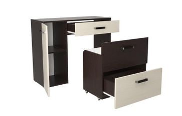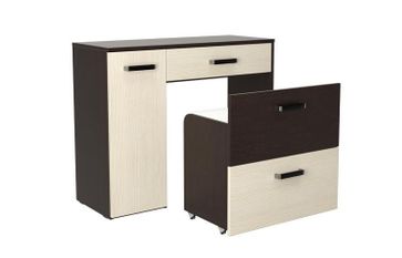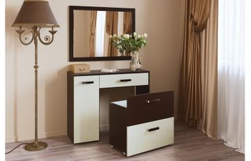 Новомодный туалетный стол трансформер станет многофункциональным в вашей спальне. Конструкция состоит из двух частей: туалетного столика и пуфика. Задвинув пуфик под столик получается комод. Пуфик стоит на роликовых опорах, что позволяет легко его двигать.
