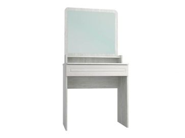 Туалетный стол ТС-12 ТН-1 в цвете сосна винтер/арктик станет незаменимым предметом интерьера Вашей спальной комнаты. Стол имеет компактные размеры. Под столешницей широкий выдвижной ящик. Столик снабжен большим зеркалом с удобной полочкой. Модель изготовлена из качественной ламинированной ДСП 16 мм. В оформлении фасадов МДФ применяется уникальная технология нанесения объемного узора (3-D). Ящик крепится телескопическими направляющими полного выдвижения.