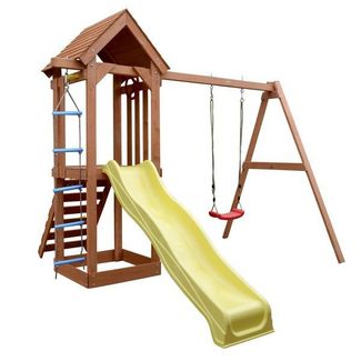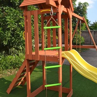 Детская игровая площадка DFC серии PLayWood — полноценный мини-городок для активного досуга детей дошкольного возраста. Рекомендуется детям с 3 лет.Центральная часть комплекса представлена небольшим домиком - башней под деревянной крышей. Нижний ярус можно использовать под небольшую песочницу. Горка с двойной волной снабжена боковыми бортиками, обеспечивающими безопасность малышей. Дополнительными элементами для развлечений служат одиночные качели и веревочная лесенка.Качели на боковой части комплекса имеют надежное подвесное крепление.Скалодром с 5-ю камнями - зацепами поможет развить ловкость.Все элементы выполнены из экологичных материалов — дерева и пластика, отвечающего действующим европейским стандартам. Дерево для защиты обработано пропиткой на водной основе. В комплект городка входит: - деревянный игровой домик с крышей (башня)- горка волнистая- веревочная лестница- качели одиночные 1 шт.- песочница- штурвал (внутри домика)- скалодром (5 камней - зацепов) Размер городка в сборе 287 х 345 х 259 см Длина горки 230 см Дерево к
