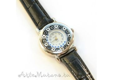Циферблат из муранского стекла с мурринами в технике Миллефиори (Millefiori). Чёрно-белые цветочки, ремешок чёрный None