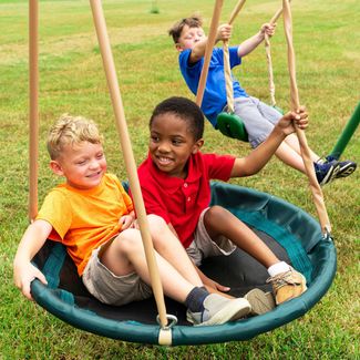 Детский игровой комплекс подходит для установки на детской площадке или дачном участке. В комплекте: качели, качели-гнездо и горка. Одновременно на комплексе могут находиться 5 детей, разрешенный возраст ребенка от 3 до 8 лет. Качели и горка изготовлены из пластмассы, устойчивой к воздействию солнечных лучей. Основные стойки изготовлены из стали, в нижней части закрыты защитными трубками (poly-pade). Гайки крепления для безопасности закрыты пластиковыеми заглушками. None Возможен самовывоз. Есть доставка.