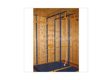 Комплекс предназначен для выполнения общеразвивающих и укрепляющих упражнений, в домашних условиях и детских учреждениях, спортивный комплекс представляет собой сборно-разборную конструкцию из металлических труб, закрепленных между потолком и полом в распор, на котором могут быть установлены до 8 спортивных снарядов, спорткомплекс упакован в картоне, в собранном виде комплекс занимает площадь 1,6 кв.м. (по потолку) 0,6 кв.м. (ширина лесницы), масса комплекса не более 35 кг, нагрузка на комплекс 150 кг, высота потолка от 2,4 до 3 метров, основа - металлическая шведская стенка Г-образной формы с турником, гимнастические кольца, канат, веревочная лестница None