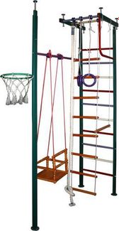 Характеристики Трехопорный комплекс. Максимум возможностей при минимальной занимаемой площади. Базовая комплектация: металлическая шведская стенка, "Г"-образный турник, турник длинный, канат, кольца гимнастические, веревочная лестница, трапеция, баскетбольное кольцо, детские веревочные качели. Ширина шведской стенки - 450 мм. Устанавливается в распор между полом и потолком, высота (2.5 - 3.0 м). Площадь 540 х 1150 мм. Вес комплекса не более 36 кг. Размер упаковки: 1,21х0,14х0,14 и 0,51х0,51х0,14 м. None