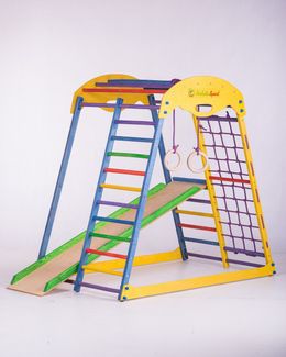 Страна происхождения: Украина Способ установки: напольный Материал: дерево Изготовлено: стойки – береза, перекладины – бук, горка – фанера Высота: 1,30 м Занимаемая площадь: 1.37 х 0.82 м; (горка: 1.53 х 0.34 м) Диаметр ступени: 0.025 м Тип ступени: дерево Комплектация: каркас с сеткой, горка, кольца Допустимая нагрузка: 60 кг Возрастная категория: 1+ Вес комплекса: 22 кг Упаковка: картонная коробка Размеры упаковки (ДхШхВ): 1 место 1.550.850.15 м None