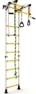 Комплекс с успехом может применяться как дома, так и в любых детских учреждениях, комнатах отдыха. Способствую физическому развитию и укреплению здоровья детей. Прочная устойчивая конструкция. Разноцветная раскраска привлечет внимание детей и сделает спортивные занятия веселыми и увлекательными. Крепление: враспор между полом и потолком Высота: от 2,35 до 2,73 м Занимаемая площадь: 0,55 (0,84) х 0,70 м Допустимая нагрузка: 100 кг Комплектация: турник, канат, кольца гимнастические, трапеция Масса комплекса: 28 кг Возможные цвета: в ассортименте. Размеры упаковки: 1,16 х 0,61 х 0,14 м ДСК прост в сборке и имеет регулируемый уровень высоты. Спорткомплекс занимает мало места и прекрасно подойдет, если вы решили купить ДСК для установки в квартире. Производитель предлагает самые разнообразные виды домашнего спортивного металлического оборудования этой серии. В каталоге детских спортивных комплексов «Карусель» вы найдёте модели как для крепления от пола до потолка, так и с пристенным способом фиксации. Производителем предлагается большое количество модификаций, рассчитанных на разный возраст, пол, рост и вес. По габаритам и количеству элементов вы также сможете подобрать оптимальный вариант для любых условий. В зависимости от того, что вы хотите оборудовать – небольшой уголок или целый мини-спор