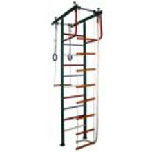 Деревянный детский спортивный комплекс — Комплектация: кольца, трапеция, качели, горка.— Горка: высота 80 см, ширина 56 см, длина 1,5 мКонструкция: — Высота: до 2,2 м— Занимаемая площадь: 3,5x2,5 м— Допустимая нагрузка: 100 кг