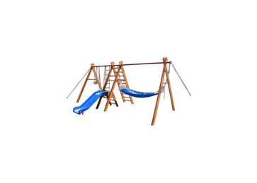 Уличный спортивный комплекс Kampfer Sunny hill предназначается выполнения общеразвивающих и укрепляющих упражнений детьми от З-х до 14 лет, весом до 100 кг. Подходит для установки вне помещений на детских игровых площадках, дачных и приусадебных участках. Для производства комплекса использованы безопасные материалы, натуральные породы дерева наиболее подходящие для использования детьми. Комплектация: — кольца — горка — качели — гамак