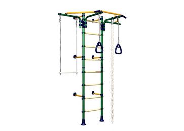 Комплекс представляет собой сборно-разборную металлическую конструкцию. Металлическая шведская стенка с мягкими обрезиненными перекладинми Детский спортивный комплекс ДСК Комета Next 2 — Возможные цвета: сине-желтый, зелено-желтый, красно-желтый — Крепление: к стене Комплектация: — турник — боковые кронштейны — канат — трапеция — кольца гимнастические