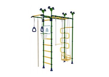 Комплекс представляет собой сборно-разборную металлическую П-образную конструкцию. Крепится враспор между полом и потолком. Металлическая шведская стенка с мягкими обрезиненными перекладинами — Возможные цвета: сине-желтый, зелено-желтый, красно-желтый — Крепление: враспор между потолком и полом Комплектация: — турник — рукоход — петлеобразный "лаз" — канат — кольца гимнастические — трапеция — качели — кольцо баскетбольное со щитом
