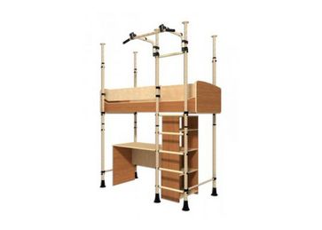 Металлическая шведская стенка-кровать с деревянными перекладинами. Крепится враспор между полом и потолком, комплекс не сложно собрать и установить. А в последствии, его можно переместить на другое место. Установка: При креплении комплекса враспор важно состояние потолка и пола - не подходят хрупкие навесные потолки, вагонка и ломкие виды ламината.