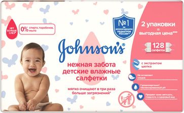 - Johnsons Нежная Забота 128 салфеток в пачке по выгодной цене 235 р. руб.;