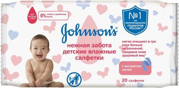 - Johnsons Нежная Забота 20 салфеток в пачке по выгодной цене 75 р. руб.;